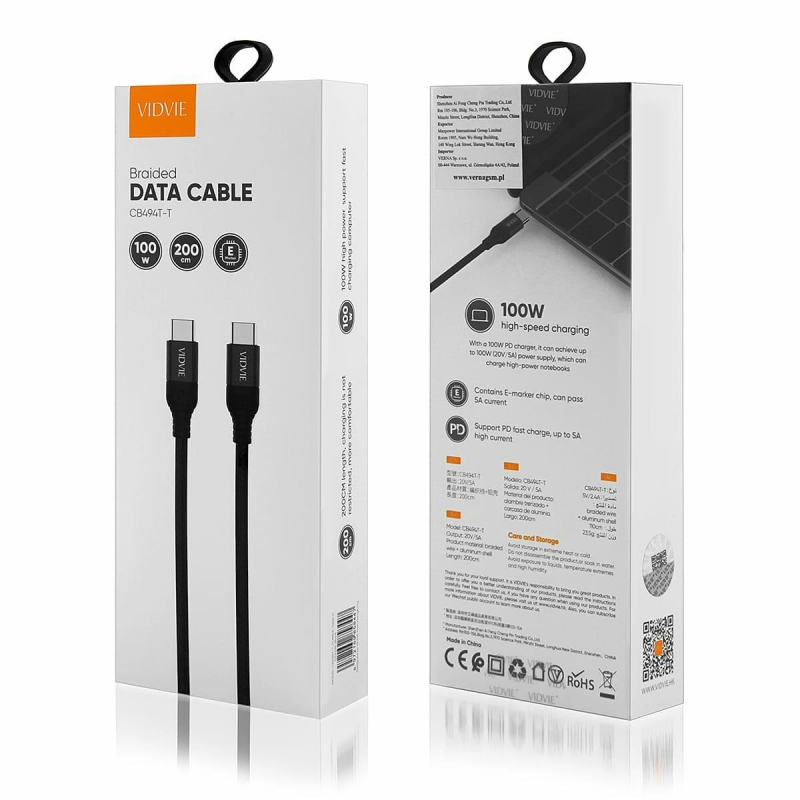 Kabel VIDVIE CB494 Type C/Type C 100W PD, 5A, 2m czarny BOX